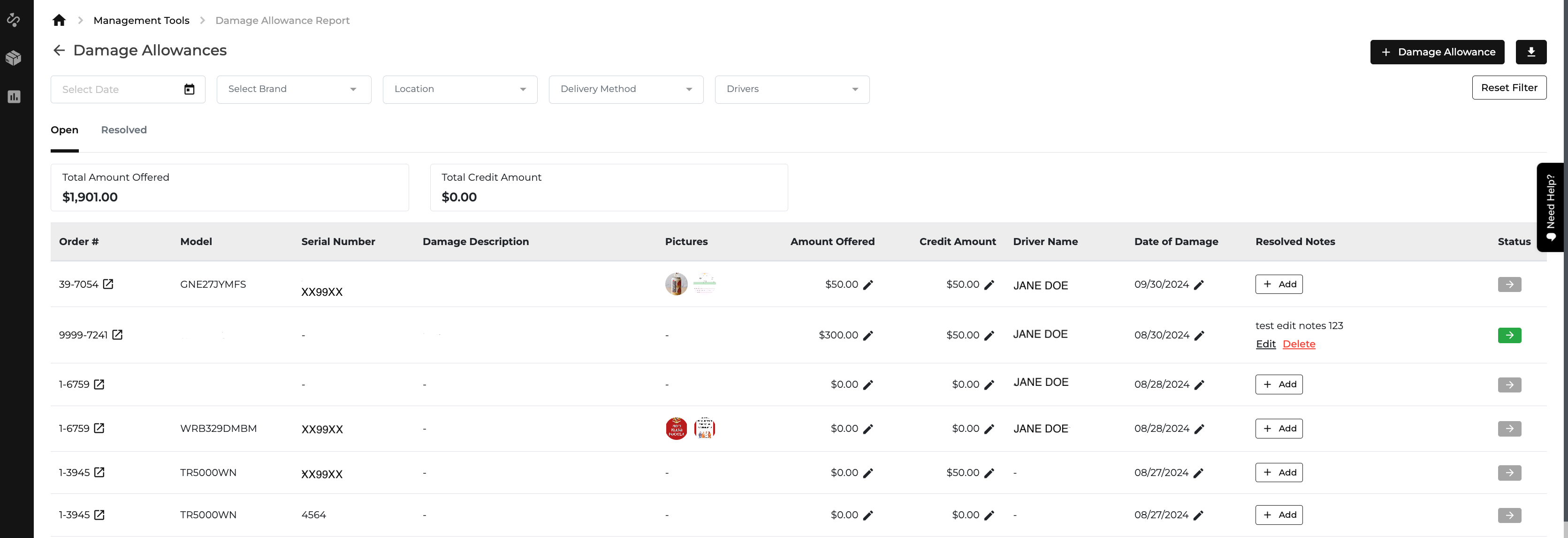 Resolved Notes are now displayed in the notes section. If the status is "Open", the section will display "None Found". If it is "Resolved", the resolved notes will appear. The Damage Allowance Note can be clicked to view details in a popup, though it is not editable.