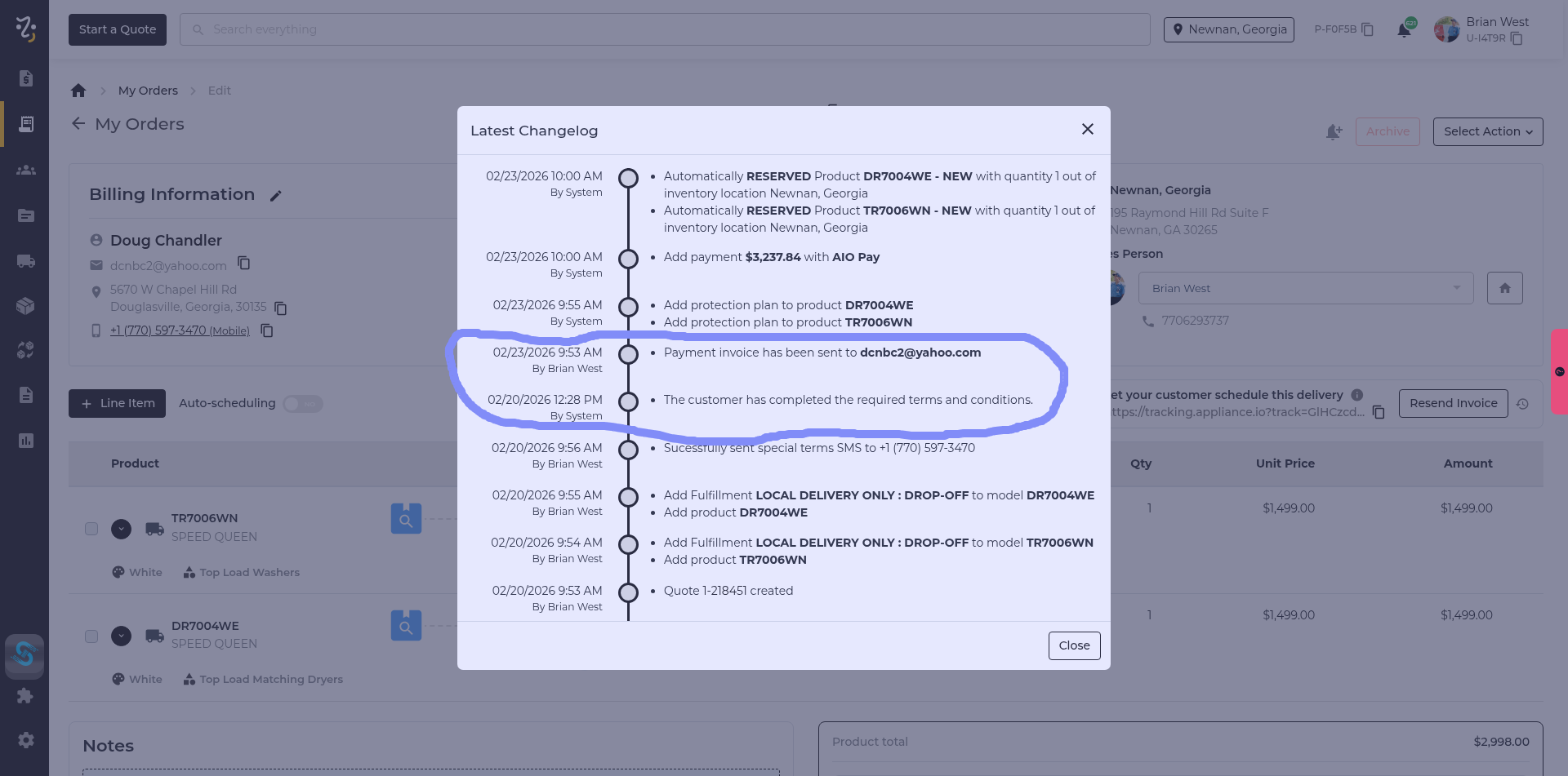 I noticed that the system is not sending over the quote after customer signs the terms and conditions. You will see in screen shot that I had to manually send the quote.